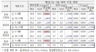 보 개방 이후 평균 체류시간이 4월 6일부터 12월 8일에서 2월 7일부터 9월 5일 감소하고, 유속도 1.2~3.9cm/s에서 1.4~6.9cm/s로 증가했다.