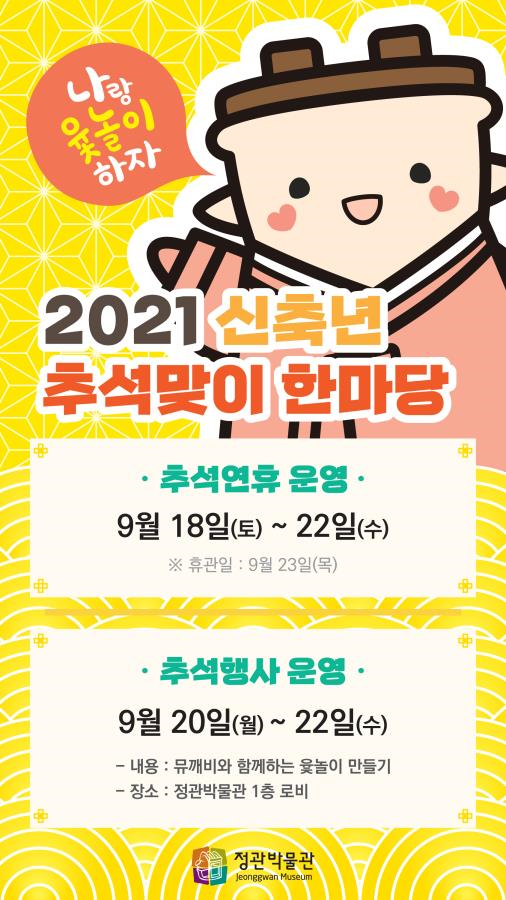 [충청뉴스큐] 부산시 정관박물관은 오는 20일부터 22일까지 3일간 추석을 맞아 박물관을 찾은 어린이들을 대상으로 비대면 체험교육행사 ‘신축년 추석맞이 한마당’을 운영한다고 밝혔다.