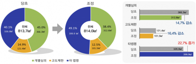 먼저 구역별 면적의 변화를 살펴보면, 규제정도가 가장 강한 ‘개별심의 구역’이 당초 면적대비 14.7% 감소한 312.6㎢로 나타났다. 규제정도가 가장 약한 ‘타법령 처리구역’은 22.7% 증가한 399.9㎢로 조사되어 이번 허용기준의 조정이 문화재 주변의 건축행위 등에 대한 규제정도를 상당부분 완화하는 효과가 있는 것으로 밝혀졌다.
