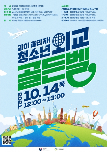 [충청뉴스큐] 외교부는 오는 10월 14일 12:00-오후 1시 우리 청소년들의 우리나라 외교 정책에 대한 관심과 이해를 제고하기 위해 전국 중·고등학생을 대상으로‘같이 울리자 청소년 외교 골든벨’행사를 개최할 예정이다.