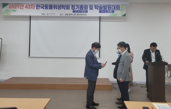또한, 학술발표대회에 참가한 김지연 수의연구사가 ‘광주지역 반려동물 소화기질병 병원체 감염 실태조사’를 구두 발표해 대상을 받았다.