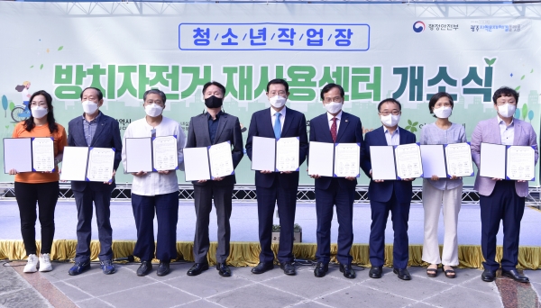 [충청뉴스큐] 방치자전거 문제 해결과 자전거 보급 활성화를 위한 ‘방치자전거 재사용센터’ 개소식 및 센터 활성화를 위한 협약식이 23일 오후 광산구 앰코로 현장에서 열렸다.