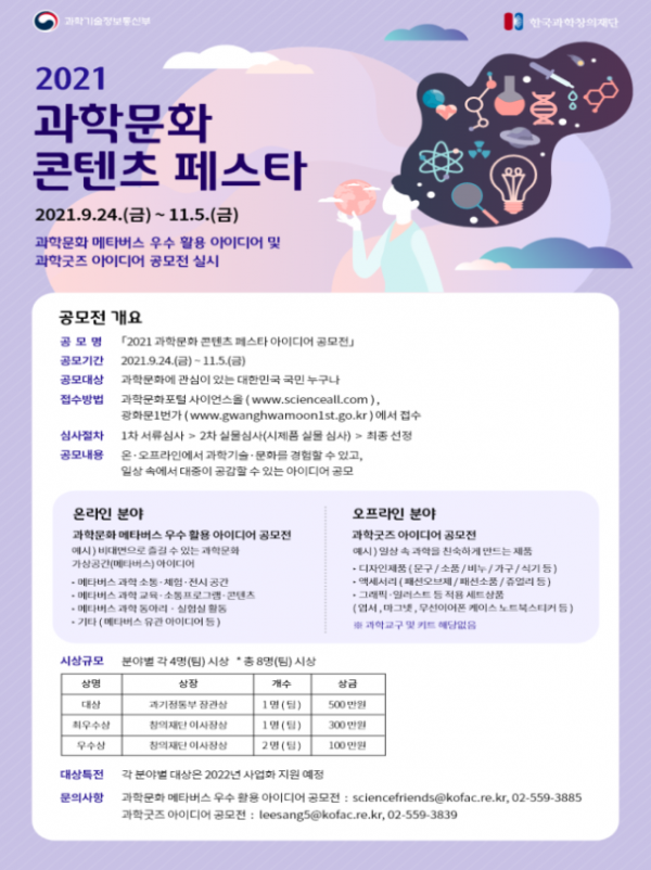 이번 축제는 ‘코로나19에 따른 일상의 변화를 준비하는 과학문화’를 주제로 국민 누구나 참여 가능한 ‘과학문화 확장 가상세계’ 우수 활용 아이디어 공모전, ‘과학팬상품’ 아이디어 공모전, 2개 분야로 진행된다.