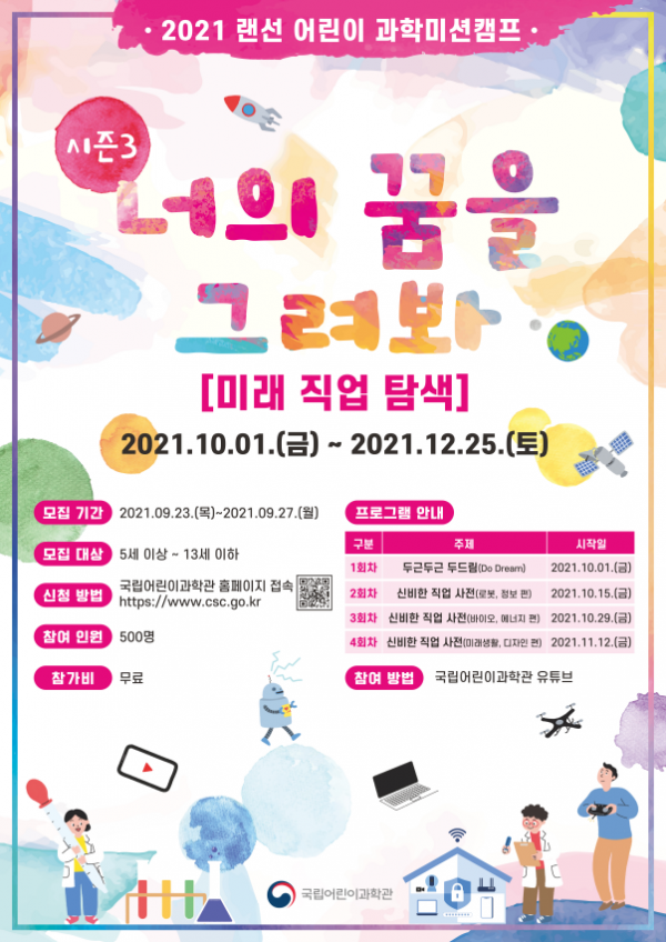2021 랜선 어린이 과학미션캠프 시즌3는 유아 및 어린이 대상으로 운영하며 참가 신청은 9월 23일 오후 2시부터 9월 27일까지 누리집를 통해 할 수 있다.
