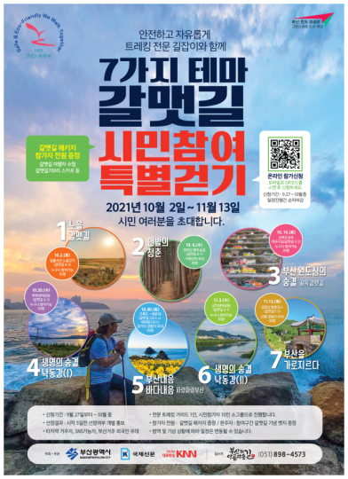 [충청뉴스큐] 부산시는 국제신문, KNN과 함께 오는 10월 2일부터 11월 13일까지 매주 1회 ‘시민참여 갈맷길 특별걷기’ 프로그램을 운영한다.