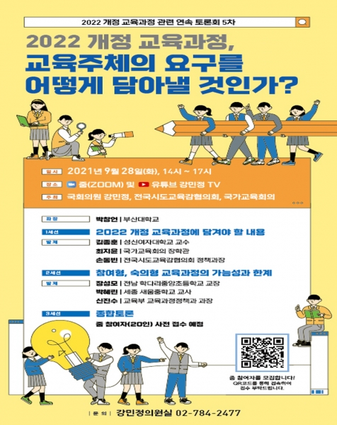 [충청뉴스큐] 강민정 의원은 오는 9월 28일 오후 2시부터 ‘2022 개정 교육과정, 교육과정 문서 어떻게 바꿀 것인가?’ 토론회를 개최한다.