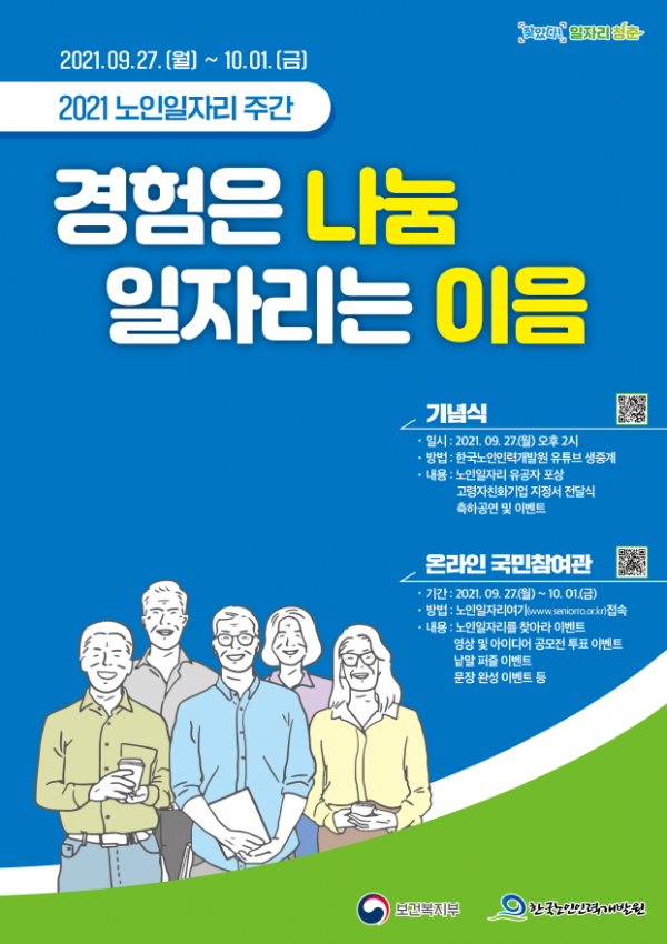 [충청뉴스큐] 보건복지부는 노인일자리 및 사회활동 지원사업에 대한 성과 공유 및 긍정적 인식 확산을 위해 9월 27일부터 10월 1일까지 ‘2021 노인일자리 주간’을 운영한다고 밝혔다.