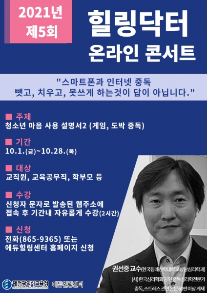 대전에듀힐링센터는 2021년 힐링닥터 콘서트를 ‘똑똑 십 대들의 마음열기’를 주제로 코칭 및 심리상담 전문가 3명을 초청, 청소년 정신건강에 대한 릴레이 강연으로 진행하며 올해는 특히 코로나19 장기화로 인해 5회에 걸친 온라인 콘서트로 운영해오고 있다.