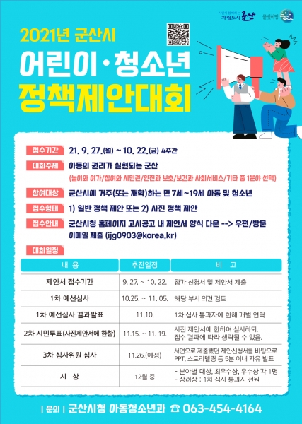 참가대상은 군산시에 거주 또는 재학 중인 만7세~만19세 아동으로 개인 혹은 팀을 구성해 참가할 수 있으며 제안서 접수기간은 오는 10월 22일까지다.