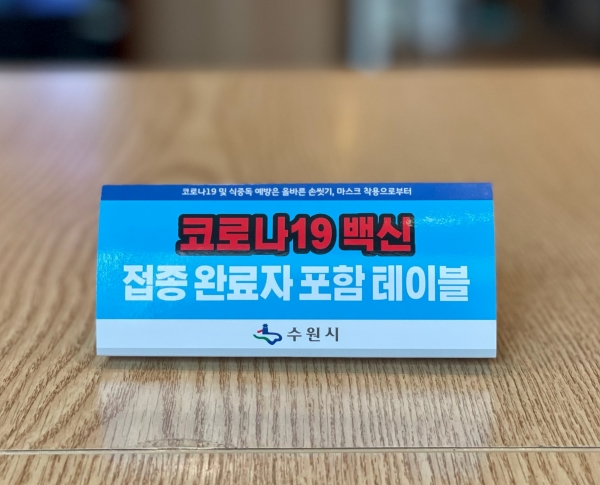 수원시는 지난 27일부터 일반음식점, 휴게음식점, 제과점 등에 ‘코로나19 백신 접종 완료자 포함 테이블’이라는 문구가 적힌 표지판을 배부하고 있다.