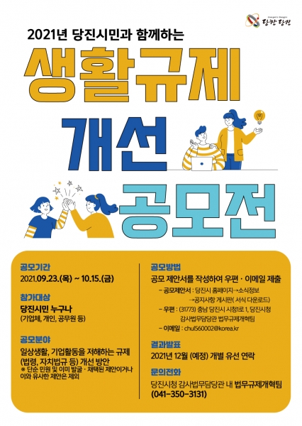 [충청뉴스큐] 당진시가 중소기업·소상공인의 현장 규제 애로부터 시민 생활 속에서 겪게 되는 불합리한 규제를 발굴 및 개선하기 위해 ‘2021년 생활규제 개선 공모전’을 10월 15일까지 개최한다고 밝혔다.