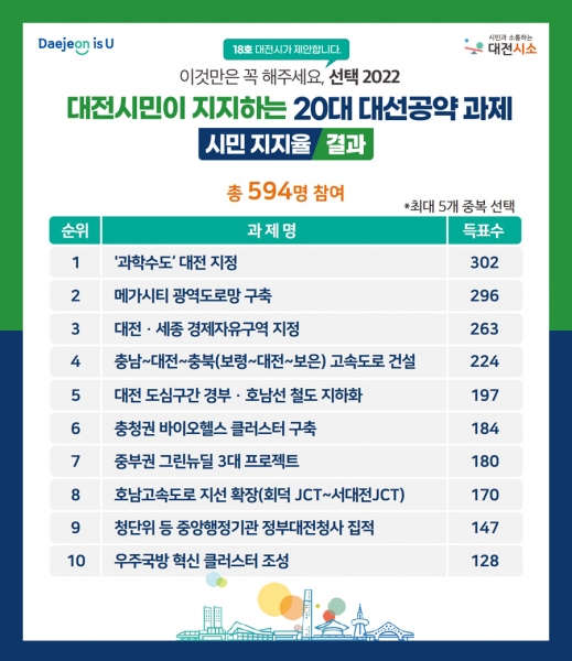 설문결과, '과학수도 대전 지정'이 302명의 지지를 받아 1위로 선정됐으며 득표율은 11,54%였다.