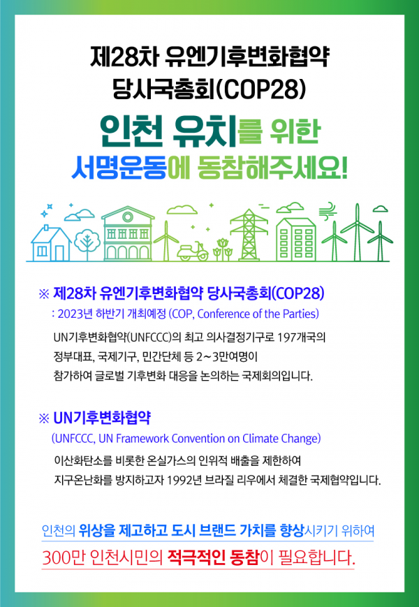 인천광역시는 올해 12월 말까지 ‘COP28 인천 유치 100만인 서명운동’을 전개한다고 밝혔다.