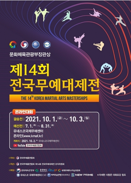 [충청뉴스큐] 국내 최대 규모의 종합무예대회인 제14회 전국무예대제전이 한국무예총연합회 주최로 10월 1일부터 3일까지 충주 유네스코 국제무예센터에서 온라인으로 개최된다.