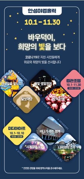또한 안성천변과 승두천 일대, 안성맞춤랜드와 내혜홀 광장 등에는 야간조명을 활용한 경관조성을 계획해 지친 시민들에게 힐링과 휴식의 공간을 제공할 예정이다.