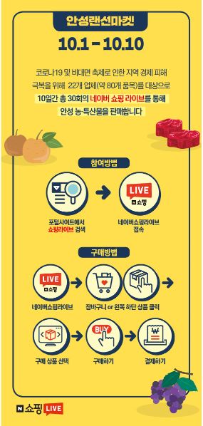 시 관계자는 “급변하는 시대 흐름 속에서 앞으로는 라이브커머스를 통해 지역의 농·특산품을 판매하는 방식이 새로운 판로가 될 것으로 기대된다”며 “안성시의 우수한 농·특산품을 만나 볼 수 있는 좋은 기회이니 많은 분들의 관심과 참여를 당부드린다”고 전했다.