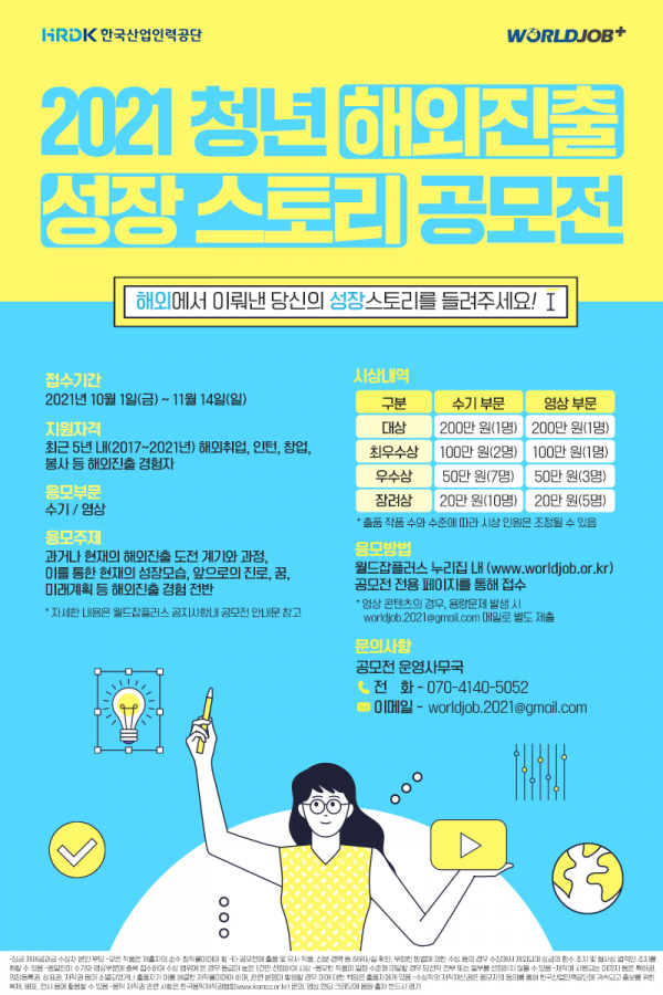 [충청뉴스큐] 한국산업인력공단은 오는 10월 1일부터 다음 달 14일까지 ‘2021년 청년해외진출 성장스토리 공모전’을 진행한다.