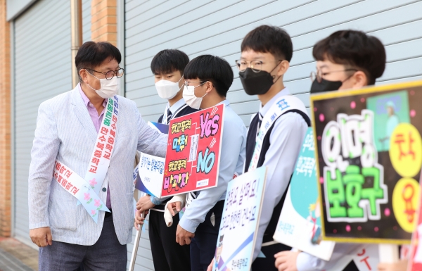 [충청뉴스큐] 도성훈 인천광역시교육감이 30일 오전 남동구 소재 만수북중학교를 찾아 학생들을 대상으로 학교폭력예방 안내 및 등교맞이 캠페인에 참가했다.
