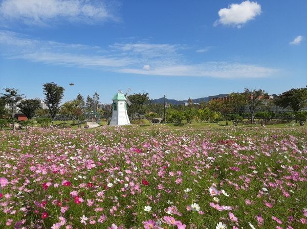 [충청뉴스큐] 청주시 유기농단지에 다양한 꽃들이 피어 아름다운 경치를 뽐내고 있는 요즘, 하얀 풍차가 보이는 꽃밭에는 하얀색, 빨간색, 분홍색 등 다양한 색채를 띠며 피기 시작한 코스모스 꽃들이 어우러져 유럽의 이색적인 풍경을 자아내고 있어 꽃밭을 배경으로 가족들의 행복한 모습을 카메라에 담고자 하는 사람들이 즐겨 찾고 있다.