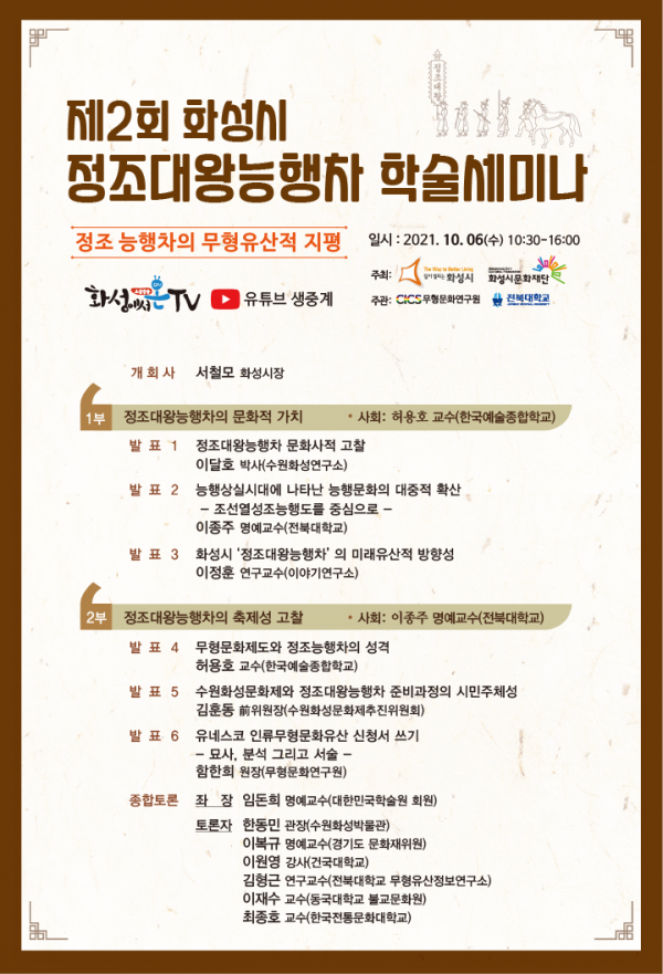 참가 대상은 관련 연구자와 학생, 시민 등 정조대왕능행차에 관심이 있는 사람은 누구나 접속해 참여가 가능하다.