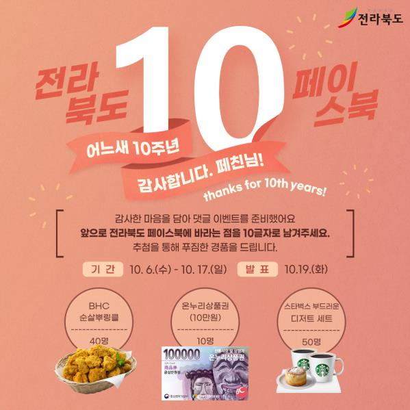[충청뉴스큐] 전라북도 공식 페이스북이 페이지 개설 10주년을 맞아 특별 이벤트를 진행한다.