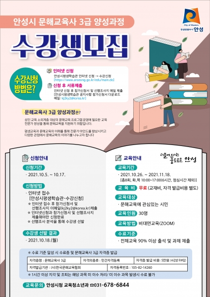 [충청뉴스큐] 안성시가 오는 10월 5일부터 10월 17일까지 ‘문해교육사 양성과정’ 수강생을 모집한다.