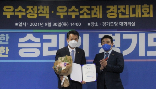 [충청뉴스큐] 경기도의회 여성가족평생교육위원회 부위원장 김성수 의원은 9월 30일 더불어민주당 경기도당 대회의실에서 열린 ‘더불어민주당 경기도당 우수조례 경진대회’에서 우수조례를 수상했다.
