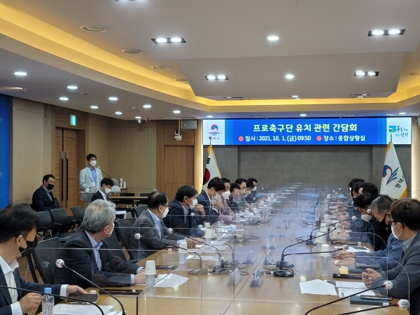 이날 간담회에서는 프로축구연맹의 프로축구단 운영 기대효과 및 경기장 입지조건, 전용구장 건립 및 운영에 따른 재정적 측면 등에 대해 제안설명이 있었으며 구장 설립과 관련한 예산 및 부지 확보 등에 대해 다양한 의견을 적극적으로 교환하는 시간을 가졌다.