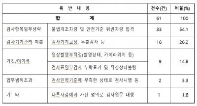 특별점검 결과, 불법 개조차량 및 안전기준 위반차량 합격처리 33건, 검사기기 관리미흡 16건, 영상촬영 부적정 및 검사표 작성 일부 누락 9건 등 61곳 검사소 1곳 당 1건의 불법행위가 있었다.