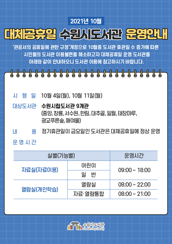 수원시도서관 관계자는 “10월에 공휴일과 대체공휴일이 4일이라 도서관 휴관일 수가 증가하게 된다”며 “시민들이 도서관을 이용하는 데 불편이 없도록 정기휴관일이 금요일인 9개 도서관을 대체 공휴일에 정상 개관하기로 했다”고 밝혔다.