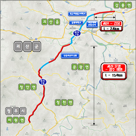 이번에 확정된 괴산~감물 구간은 지난 5월 국도 19호선으로 승격된 도로로 총사업비 302억원 투입해 연장 2.4km의 단절구간 도로를 신설한다.