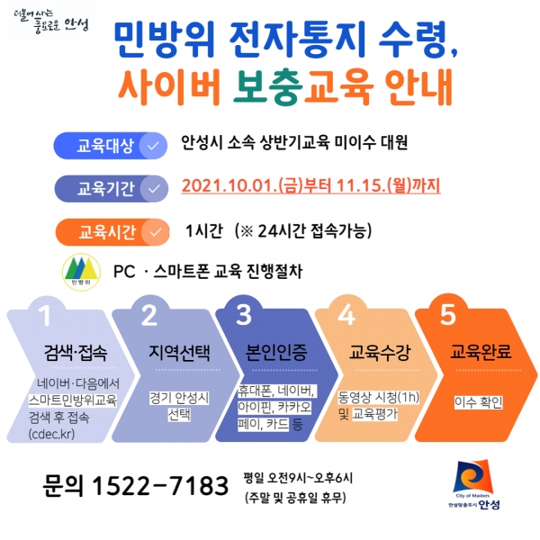 강성복 안성시 시민안전과장은 “민방위 교육은 전시·재난 등 비상시에 우리 가족과 지역사회의 안전을 지키기 위해 실시하는 교육”이라며 “민방위 교육 미이수 시 과태료 10만원이 부과되는 만큼, 민방위대원들이 기간 내에 사이버 민방위 교육을 이수하시길 바란다”고 참여를 독려했다.