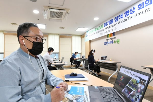 [충청뉴스큐] 수원시가 국제자매결연을 추진하고 있는 미국 피닉스시와 5일 온라인 플랫폼을 활용해 영상회의를 열고 폐기물 정책을 교류했다.