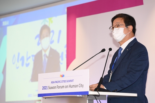 염태영 수원시장을 비롯한 지방정부 대표들은 5일 수원컨벤션센터에서 대면·비대면 병행방식으로 열린 아·태도시 정상회의·2021 인간도시 수원포럼 폐회 세션에서 선언을 발표하고 “두 회의가 정례적으로 함께 개최돼 ‘다층적 거버넌스’의 모범이 되길 바란다”며 “아·태 환경장관회의가 지속해서 운영을 지원해 달라”고 말했다.