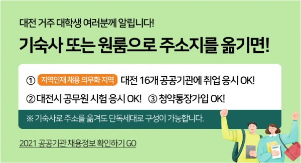 시와 대학은 대학 기숙사와 인근 원룸으로 전입한 대학생들에게 기숙사 전입 시 단독세대 구성 가능, 대전에 3년 이상 주민등록상 거주시 대전시 공무원 시험 응시 가능, 청양통장도 가입 가능함을 홍보했으며 특히 2018년에 대전이 혁신도시로 지정됨에 따라, 대전에 소재한 16개 공공기관에 취업도 가능함을 홍보하는데 적극 노력해 왔다.