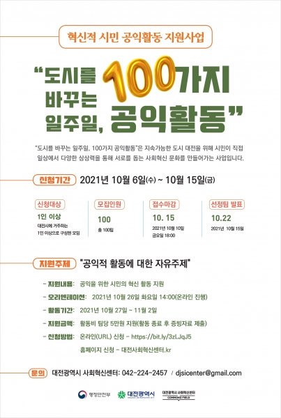 ‘도시를 바꾸는 일주일 100가지 공익활동’은 대전 시민이 일상에서 다양한 상상력과 주제로 공익활동을 진행하면서 사회혁신 문화를 확산하는 혁신적 시민 공익활동 지원사업이다.
