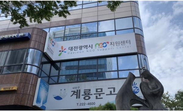 대전NGO지원센터는 중구 중앙로 119, D-STATION 5층에 위치한 곳으로 대전시에 등록된 600여개의 비영리민간단체에 모임공간과 교육장소 등을 제공하고 공익활동가 역량강화 및 비영리민간단체 육성·지원 등과 같은 각종 비영리민간단체 지원업무를 수행하고 있다.