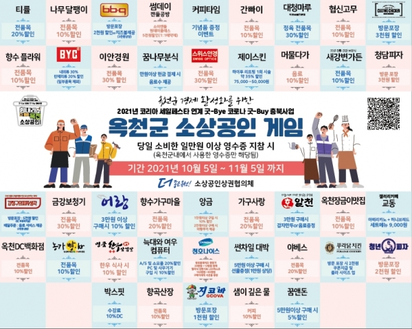 옥천군 및 소상공인상권협의체가 시행하는 이 행사는 오는 11월 5일까지 상권 활성화를 위한 소상공인 소비촉진 행사로 진행된다.