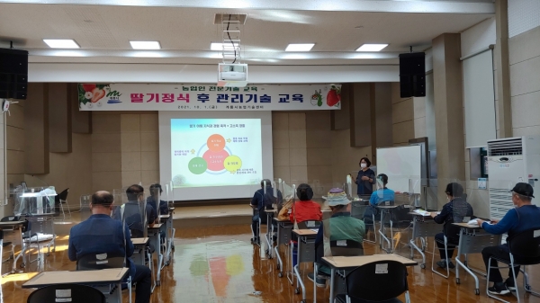 이번 교육은 딸기 정식 후 올바른 관리 요령 및 재배기술에 대한 교육을 통해 고품질 딸기 수확, 농업 생산성 향상 및 농가소득 증대를 위해 실시됐으며 코로나19 예방을 위해 발열체크, 마스크 착용 및 좌석 간 띄어앉기 등 방역수칙을 철저히 준수하며 진행됐다.