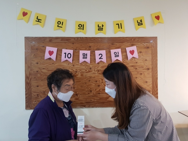 이번 나눔 활동은 코로나 상황으로 인해 매년 10월 2일 실시했던 노인의 날 기념행사를 대신해 복지관 이용 어르신들의 안부 확인과 생활 속 방역수칙 준수를 다시 한번 점검하는 취지로 진행됐다.