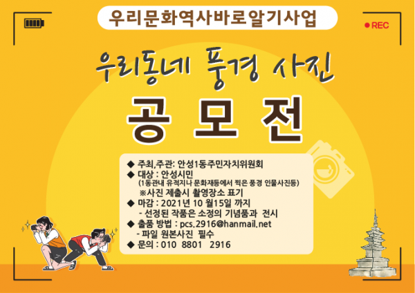 안성1동 관내 유적지나 문화재 등에서 찍은 풍경, 인물사진 등을 오는 10월 15일까지 제출하면 우수작품을 선정한 후 전시회도 개최할 예정이다.