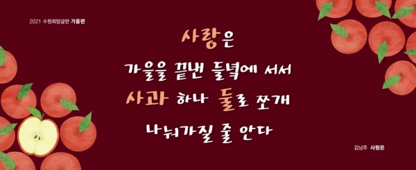 2021년 수원희망글판 가을편 문안 선정작은 김남주 시인 ‘사랑은’의 한 구절 ‘사랑은 가을을 끝낸 들녘에 서서 사과 하나 둘로 쪼개 나눠가질 줄 안다’이다.