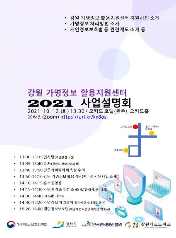 설명회는 강원도 내 모든 중소기업과 데이터 활용 기관을 대상으로 가명처리 절차, 가명정보 활용방법, 지원사업 등을 소개할 예정이며 대면으로 참석하기 힘든 분들을 위해 온라인 플랫폼을 동시에 준비할 것이다.
