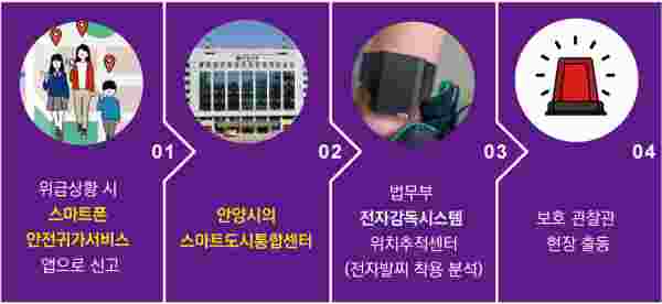 길을 걷는 중 위기감을 느껴‘스마트폰 안전귀가서비스앱’으로 SOS를 요청할 경우, 스마트도시통합센터를 통해 법무부 전자감독시스템으로 전송돼 신고위치로부터 반경 20m이내 전자발찌 착용 자가 있는지를 파악하고 필요 시 경보를 발생시켜 보호관찰관이 현장에 출동하는 서비스다.