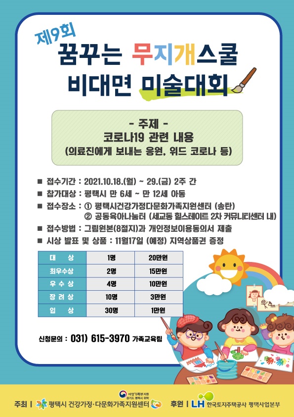 [충청뉴스큐] 평택시건강가정·다문화가족지원센터에서는 오는 18일부터 29일까지 비대면 ‘꿈꾸는 무지개스쿨 미술대회’를 실시한다.