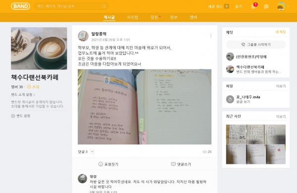 책수다 랜선 북카페 활동은 네이버 밴드를 통해 온라인에서 진행되며 필사이벤트, 리뷰이벤트와 함께 주1회 책수다 채팅데이를 운영한다.