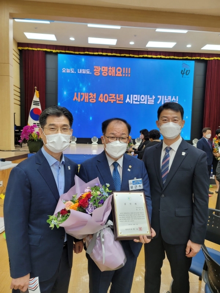 [충청뉴스큐] 경기도의회 교육행정위원회 유근식 의원이 지난 5일 광명시청 개청 40주년을 맞아 개최된 시민의 날 기념식에서 광명시정과 교육 발전에 기여한 공로를 인정받아 광명시로부터 감사패를 전달받았다.