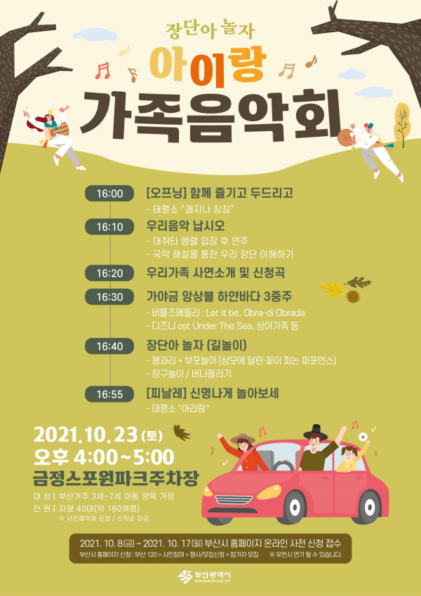 [충청뉴스큐] 부산시는 오는 23일 오후 4시 금정구 스포원 야외주차장에서 온 가족이 함께 즐기고 체험할 수 있는 아이랑 가족음악회 ‘장단아 놀자’를 개최한다고 밝혔다.