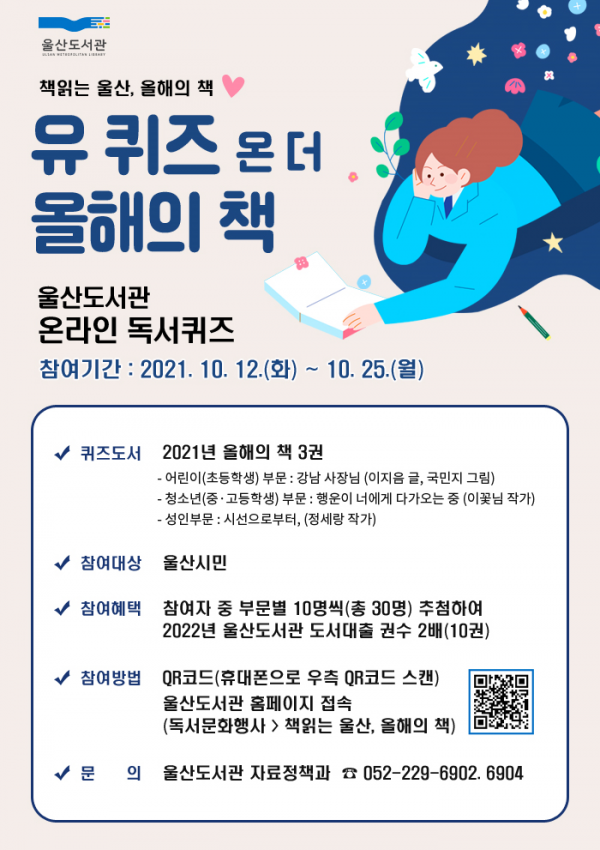 [충청뉴스큐] 울산도서관은 12일부터 25일까지 ‘2021년 책 읽는 올해의 책’ 활성화 프로그램으로 온라인 독서퀴즈 ‘유 퀴즈 온 더 올해의 책’을 개최한다.