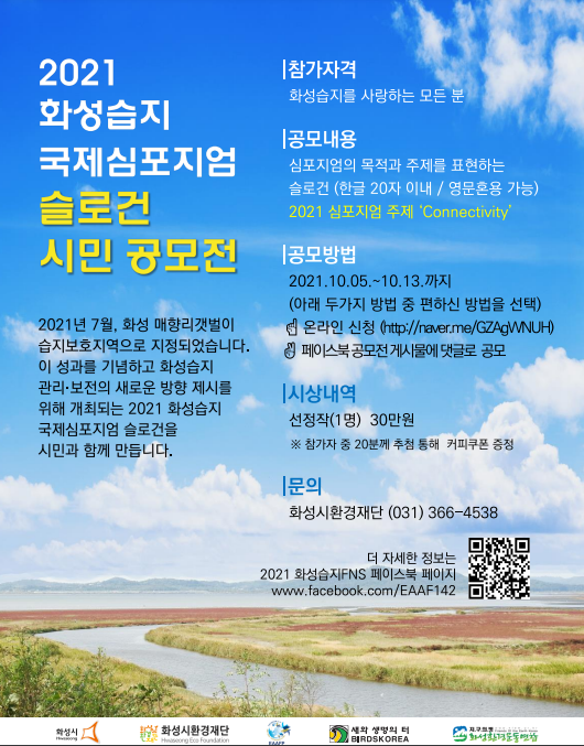 이번 ‘2021 화성습지 국제심포지엄 슬로건 시민공모전’은 화성습지가 지난 2018년 EAAFP의 네트워크 서식지로 등재되고 2021년 7월 매향리갯벌이 연안습지보호지역으로 지정되는 성과를 기념하고 ‘2021 화성습지 국제심포지엄’을 시민들과 함께 만들어 가기위해 기획됐다.